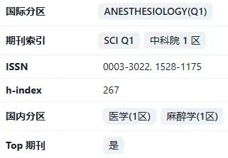 ANESTHESIOLOGY(《麻醉学》)创刊于1940年,是美国麻醉医师协会(ASA)的官方期刊,最新发布的影响因子为9.1(2025)。作为麻醉学领域全球排名前三的顶级期刊,专注于发表围手术期医学、重症监护与疼痛医学的高质量基础、临床和转化研究,对全球麻醉学诊疗指南制定与研究方向具有决定性引领作用,是麻醉学领域最具影响力的核心期刊之一。根据2025年中科院最新分区,大类学科为医学1区,小类学科麻醉学1区,且为TOP期刊,学术影响力位居全球同领域前列。
